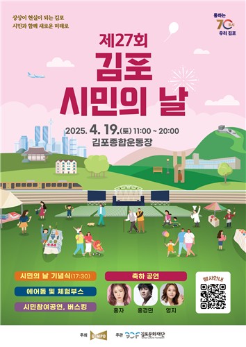 김포시(시장 김병수)가 제27회 김포시민의 날 기념행사를 오는 4월 19일(토) 김포종합운동장에서 개최한다. 이번 행사는 '서로를 응원하고 함께하는 우리 김포'라는 공동체 정신을 되새기며, 시민이 주인공이 돼 즐기고 소통하는 하루 종일 축제로 펼쳐진다. 오전 11시부터 오후 8시까지 진행되며, 시민 누구나 자유롭게 참여할 수 있다.