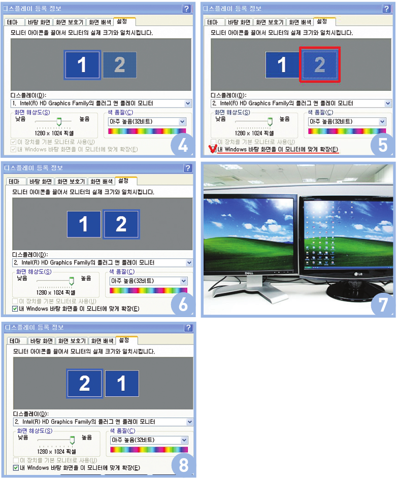 ❻ 2번 모니터 그림을 클릭 후, 내 Windows 바탕 화면을이 모니터에 맞게 확장 항목에 체크 한후 적용 버튼을 누른다.
