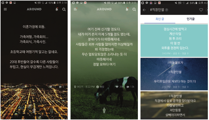 사람이라면 누구에게나 쉽게 털어 놓기 힘든 상처 하나쯤은 있기 마련이다. 허물없이 속마음을 터놓을 수 있는 친구가 있으면 좋겠지만 서로가 다 힘들기에 그조차도 미안해지는 세상. 그러나 SNS시대는 다행스럽게도 당신에게 그 상처를 혼자 안고 가지 않아도 된다고 말해준다. 최근 많은 이들의 공감을 불러일 으키며 급부상하고 있는 앱 ‘어라운드(Around)’는 아이디도, 이름도, 연락처도 기입할 필요 없이 철저하게 익명성에 기반해 서비스되고 있는 SNS다.