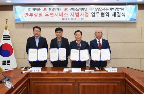 창녕군(군수 성낙인)은 지난 29일, 관내 복지 사각지대 발굴과 지원에 협력하기 위해 창녕우체국(국장 정이동) 및 우체국공익재단(이사장 박종석), 창녕군지역사회보장협의체(민간위원장 김희정)와 '안부살핌 우편서비스 사업' 업무협약을 체결했다.