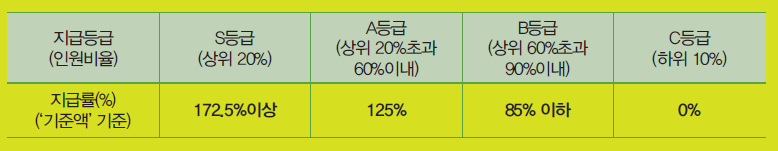 성과상여금의 지급등급과 등급별 지급률은 아래와 같다.