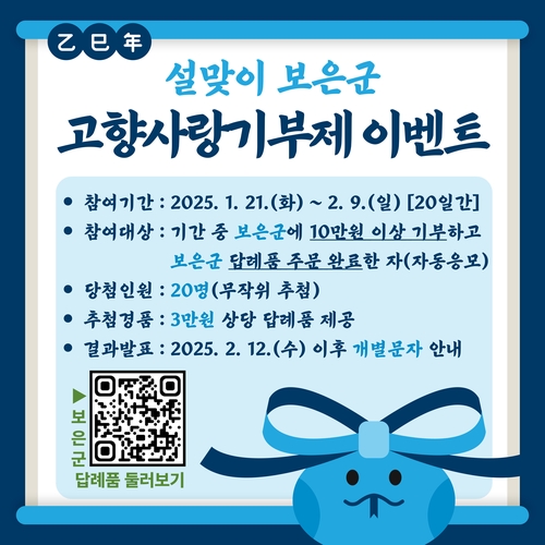 보은군은 설 명절을 맞아 고향을 사랑하는 마음을 전하고 기부문화를 활성화하고자 다음 달 9일까지 '보은군 고향사랑기부제 설맞이 이벤트'를 진행한다고 밝혔다.