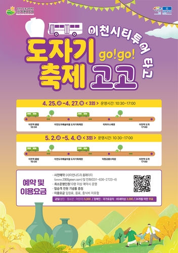 이천시(시장 김경희)는 제39회 이천도자기 축제 기간을 맞아 관광객을 위한 특별한 시티투어 프로그램인 '이천시티투어 타고 도자기축제 고(GO)! 고(GO)!'를 오는 4월 25일부터 5월 4일까지 운영한다고 밝혔다.