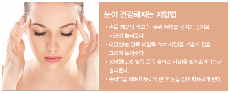 기온과 습도의 변화, 황사와 미세먼지가 많은 봄에는 눈이 피로해지기 쉽다. 안경보다 콘택트렌즈를 더 많이 착용하고 텔레비전, 스마트폰, 컴퓨터 등으로 인해 한시도 쉴 틈이 없는 현대인의 눈 건강을 위한 건강법을 알아보자.