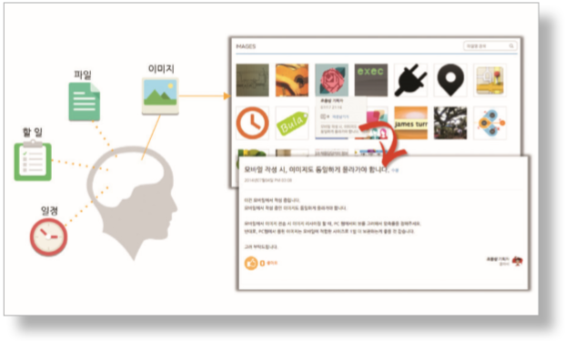 또 하나 중요한 포인트는 할일, 의사결정, 파일, 이미지 중 하나만 기억을 해도 예전 글을 쉽게 찾을 수 있는 구조로 구성돼 있다.