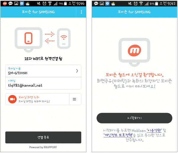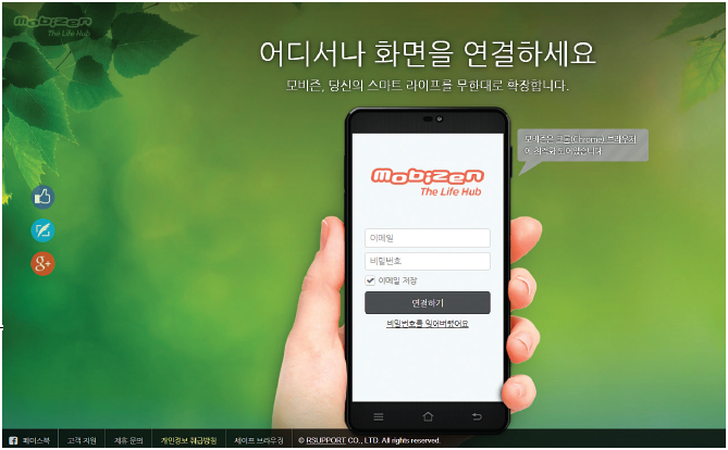 먼저 자신의 스마트폰 플레이마켓이나 앱스토어에서 ‘모비즌’을 다운받아 설치한 후, 실행해보자. 첫 화면에서 이메일 주소와 비밀번호를 간단하게 입력해보자. 그리고 PC 모니터에서 www.mobizen.com 웹 사이트로 들어간 후, 스마트폰에 입력한 이메일 주소와 비밀번호를 똑같이 입력하도록 하자.