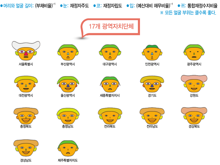 첫째, 머리에는 지방자치단체 자산대비 부채비율의 역수(逆數)로 구성했다 [(부채비율)-1]. 지자체의 부채비율이 높을수록 머리는 작게 표현되는데, 이는 일반적으로 무리하게 돈을 끌어와 진행한 대형 사업의 결과인 경우가 많다. 이 지표는 해당 자치단체가 그동안 재정운영을 어떻게 해왔는지를 판단할 수 있는 지표가 된다.