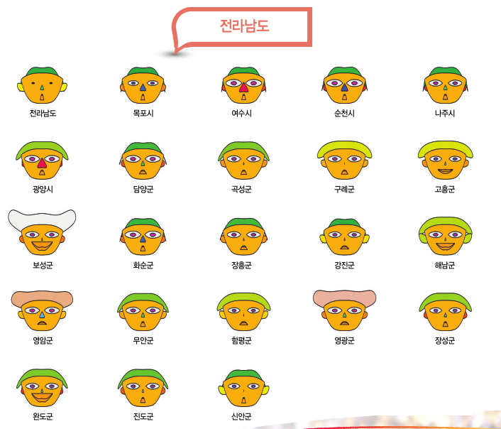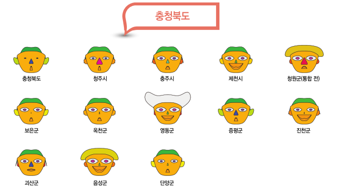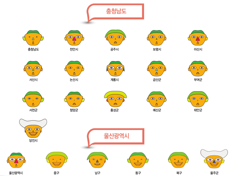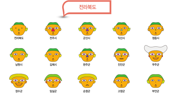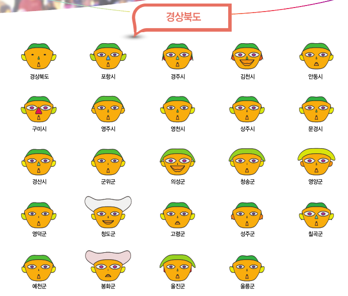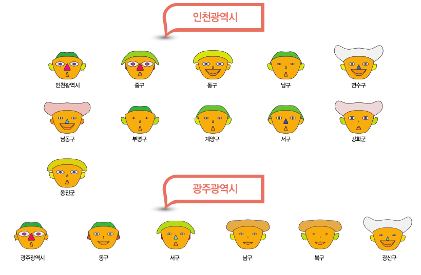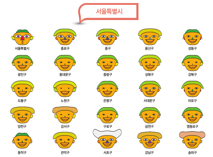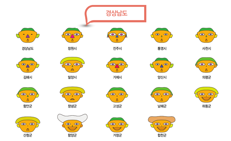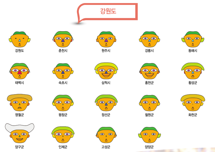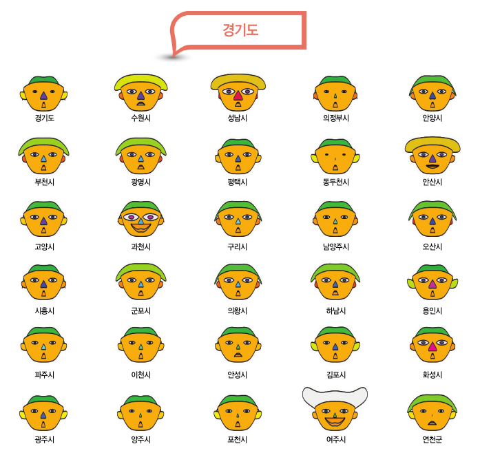 넷째, 입은 예산대비 채무비율의 역수(逆數)로 구성했다 [(예산대비 채무비율)-1]. 예산대비 채무비율은 지방자치단체의 채무상황을 판단하는 가장 일반적인 지표로 해당연도 예산 총규모 대비 채무 총규 모의 비율을 말하며, 이 값이 낮을수록 재정이 건전한 것으로 판단한다. 자치단체의 지난 한 해 동안의 채무상황을 단순히 지방채무의 절대규모만으로 판단하기보다 자치단체의 총예산 규모에 대비한 지방채 잔액비율로 산정해 해당단체의 재정여건이 감안된 채무상황을 보다 정확하게 진단함으로써 재정 건전성을 판단할 수 있는 중요한 지표다. 본 연구에서 예산대비 채무비율이 높으면 입 모양이 작고 입꼬리가 아래로 처지게 보이며, 예산대비 채무비율이 낮으면 입 모양이 크고 입꼬리가 위로 올라가게 보인다.