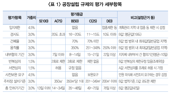 공장설립에 대한 규제의 세부항목은 대한상공회의소 전국규제지도 홈페이지에서 제공하는 아래의 <표 1>과 같다. 공장설립의 규제에는 입지제한, 경사도, 건폐율, 용적률, 내부협의 기간, 반복심의, 서면심의, 사전보완 요구, 주차장 설치기준, 총 인허기간으로 구성된다. 최고등급인 S의 경우에는 13일 이하의 총 인허기간만 있지만, 최저등급인 D의 경우는 업종제한 등 6가지의 규제가 존재한다.