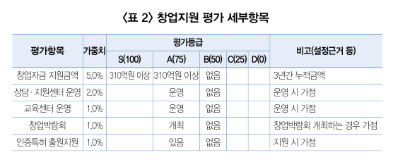 창업지원은 창업자금 지원금액, 상담·지원센터 운영, 교육센터 운영, 창업박람회, 인증·특허출원 지원의 항목으로 구성된다. 최고등급인 S의 경우에는 3년간의 창업지원 누적금액이 300억원을 넘는 수준이고 다양한 지원활동을 벌이고 있는 반면에, 최저등급인 D의 경우는 창업지원 활동이 거의 없는 경우가 된다.