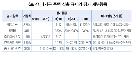 다가구주택 신축규제에 대한 평가 세부항목은 대한상 공회의소 전국 규제지도 홈페이지에서 제공하는 아래의 <표 4>와 같다. 다가구주택 신축규제는 입지제한, 용적률, 조경조성 의무, 건축거리 제한, 총 인허가기간의 항목으로 구성된다. 최고 등급인 S의 경우에는 이러한 5가지 규제가 전혀 없는 반면에, 최저등급인 D의 경우는 과도한 입지제한, 용적률 200%, 건축거리 제한 3미터 이상, 총 인허가기간이 36일 이상이 걸리게 된다.
