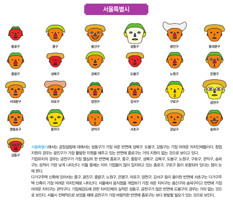 이를 종합해보면, 가장 좋은 체르노프 얼굴의 색깔과 모양의 조합은 ‘흰색 얼굴-흰색 머리-자색 눈동자-빨간색 코-미소 짓는 입-노란색 귀’이고, 반면에 가장 나쁜 조합은 ‘빨간색 얼굴-초록색 머리-눈동자가 안 보이는 눈-검정색 코-위 아래로 긴 모양의 입’이 된다. 이러한 기업체감도에 대한 체르노프 얼굴의 모양과 크기를 기준으로 해서 우선 서울시를 살펴본다.