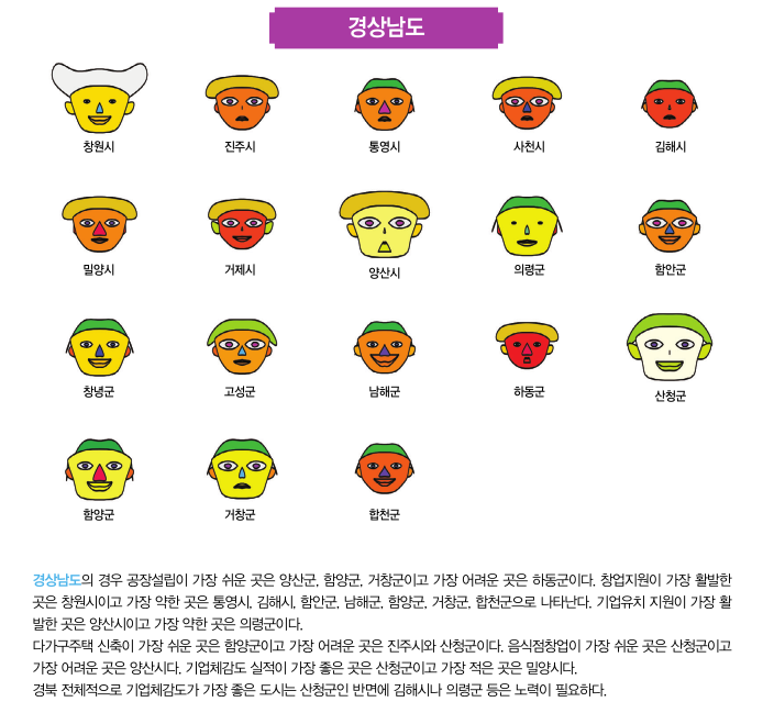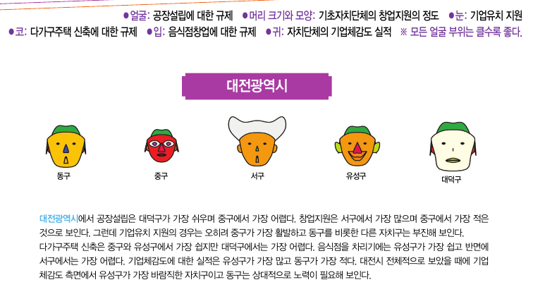 첫째, 얼굴의 크기는 공장설립에 대한 규제를 표현하는 데, 제조업에 있어서 공장설립은 가장 중요한 요소가 되기 때문이다. 공장설립에 대한 지방자치단체의 규제가 적을수록 얼굴의 크기는 크게 나타나고 반면에 규제가 많고 복잡할수록 얼굴의 크기는 작게 나타난다.