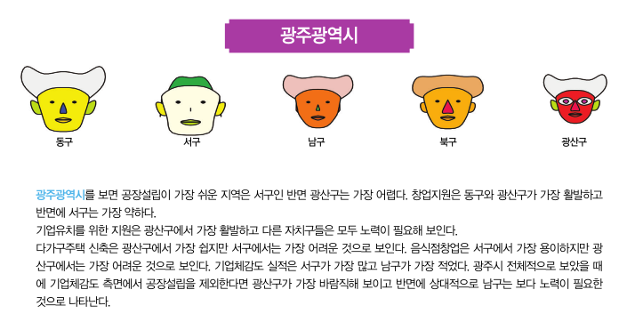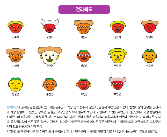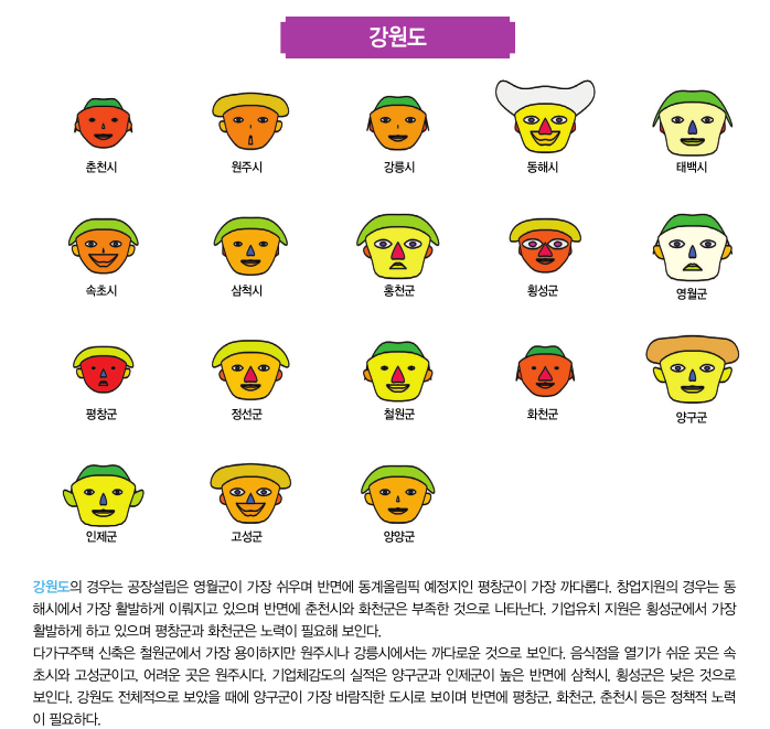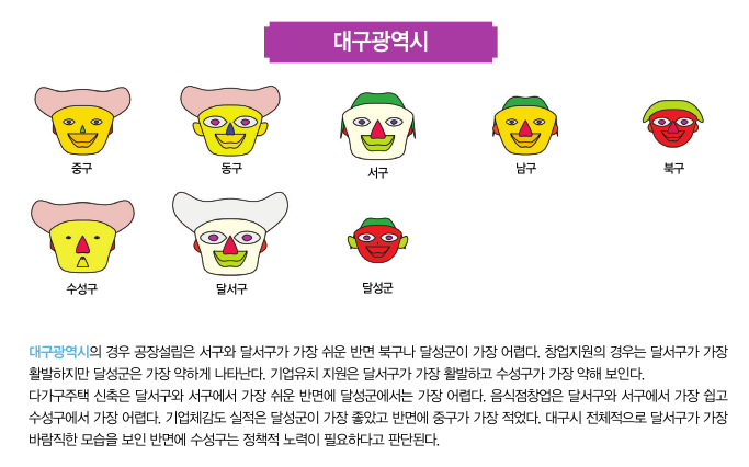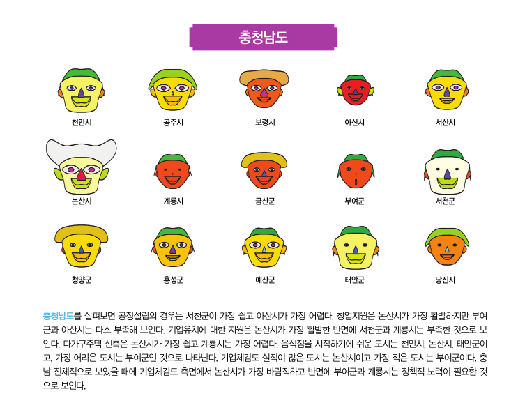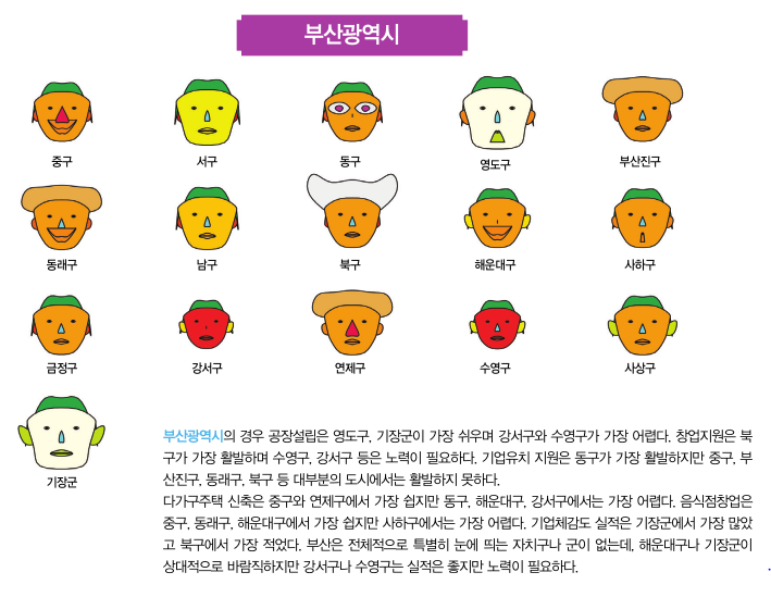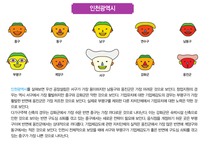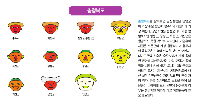 이번 2월호에서는 대한상공회의소에서 작년에 실시했던 기업체감도 분석의 자료를 활용해 체르노프 얼굴로 광 역 자 치 단 체 별 로기초자치단체들 간의 얼굴을 비교하려고 한다. 기초자치 단체들 간의 공장설 립, 다가구주택 신축, 음식점창업, 창 업 지 원 , 기 업 유 치지원, 그리고 자치 단체 실적에 대한 상대적인 비교가 얼굴의 각 부분에 나타나게 된다. 얼굴, 머리, 눈, 코, 입, 귀의 크기가 크거나 웃고 있는 자치단체들은 기업체감도 지표의 점수가 좋은 도시들이고 반면에 이러한 요소들이 작거나 화난 얼굴의 자치단체들은 기업체감도가 낮은 도시라고 생각할 수 있다.