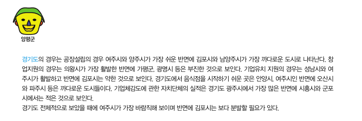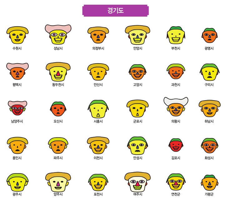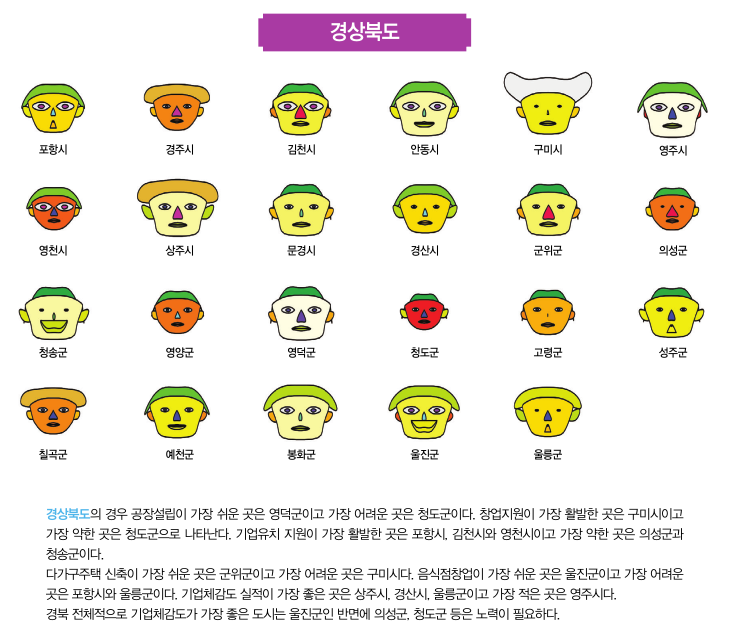 셋째, 눈의 크기는 기업유치 지원을 나타내도록 했는 데, 기업이 들어올 때에 주민들의 눈이 커진다는 것을 상징적으로 표현하기 위함이다. 기업유치 지원에 대한 규모와 정책의 수가 많은 경우는 눈의 크기가 커지지만 그렇지 않은 경우는 눈의 크기는 작아진다. 기업유치 지원에 대한 세부항목은 대한상공회의소 전국 규제지도 홈페이지에서 제공하는 아래의 <표 3>과 같다. 기업유치 지원은 지난 3년간의 조세감면 지원건수, 보조금 지원금액, 기반시설 지원금액, 경영자금 지원금 액, 그리고 행정지원 건수의 항목으로 구성된다. 최고등 급인 S의 경우에는 3년간의 조세감면 지원건수 1400 건 이상, 보조금 지원금액 25억원 이상, 기반시설 지원금액 36억원 이상, 경영자금 지원금액 85억원 이상, 그리고 행정지원 건수 600건 이상인 반면에, 최저등급인 D의 경우는 이러한 기업유치 지원활동이 거의 없는 경우가 된다.