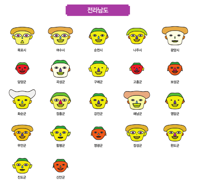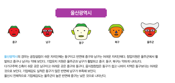 둘째, 머리의 크기와 모양은 기초자치단체의 창업지원의 정도를 표현하도록 했는데 이는 최근의 창업은 지식 및 정보산업을 중심으로 이뤄지고 있을 뿐 아니라 창업 자체가 상당히 복잡하고 종합적인 활동이라는 점에서 착안했다. 창업지원에 대한 규모와 정책의 수가 많은 경우는 머리의 크기와 모양이 크게 되지만 그렇지 않은 경우는 머리의 크기와 모양이 작게 된다.