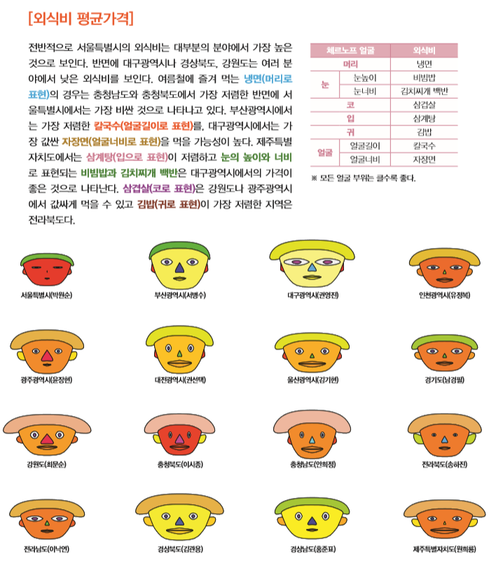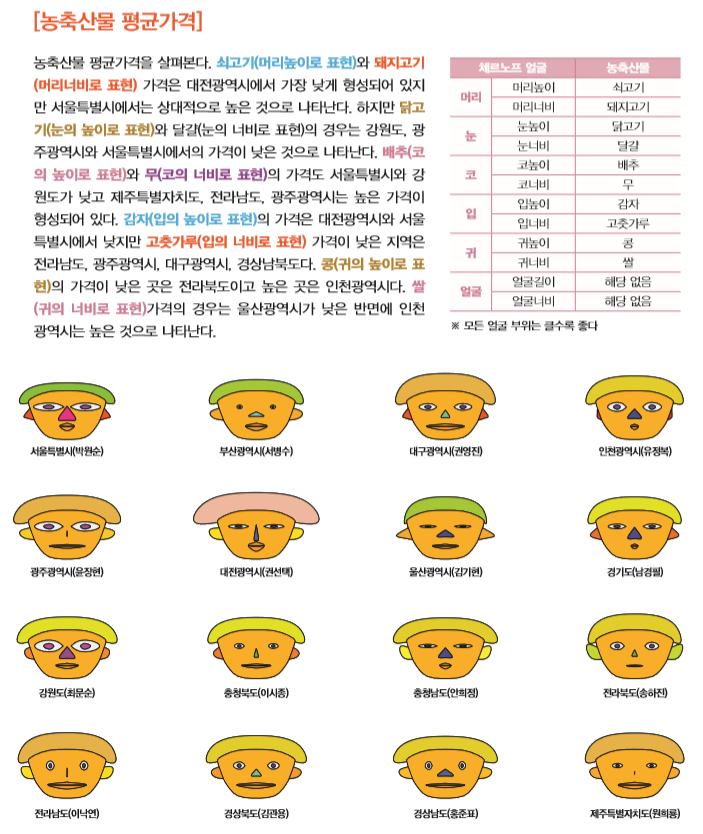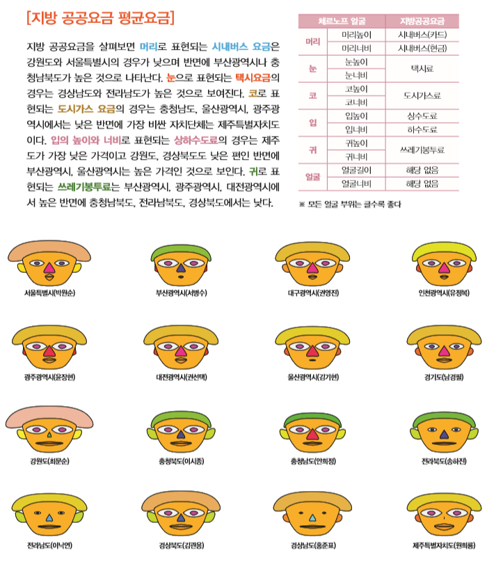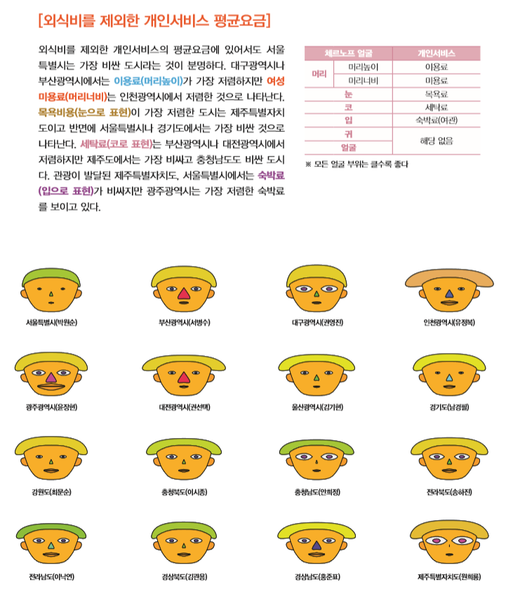 이번 호에서는 체르노프 얼굴(Chernoff Face)을 활용한 광역자치단체의 지방물가에 대한 국민체감지표를 살펴보고자 한다. 여기에서 다루고자 하는 광역자치단체의 통계는 4가지이고 여기에는 ▲지방공공요금 평균요금 ▲외식비 평균가격 ▲외식비를 제외한 개인서비스 평균요금 ▲농축산물 평균가격이 포함된다. 각 통계자료의 경우는 행정자치부에서 제공하는 지방물가정보공개서비스(mulga.go.kr/price)의 자료를 통해 구축하였는데, 가장 최근 것은 2014년 11월 기준의 통계자료다. 지방물가정보공개서비스는 서민생활과 밀접하게 관련된 30개 주요품목의 가격을 조사하여 매 월초 시도별 및 품목별 비교정보를 제공하는 시스템이다. 세종특별자치시의 경우에는 아직 지방물가정보공개서비스에 통계가 마련되지 않아 본 분석에 포함시키지 못했다.