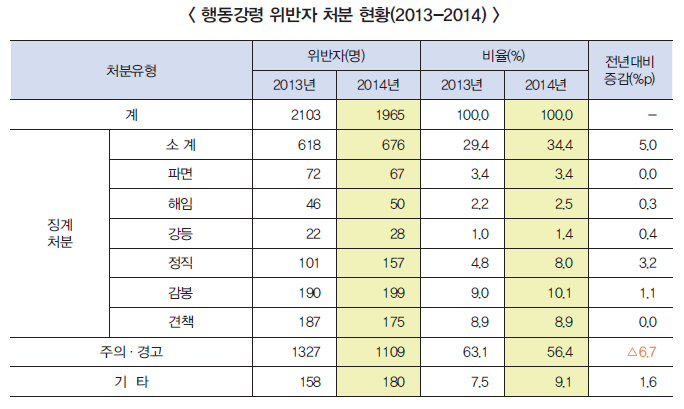2013년에는 전체 위반 공무원의 11.5%가 파면·해임 등의 중징계 처분을 받았지만, 지난해에는 15.4%가 중징계 처분을 받았으며, 비교적 가벼운 주의·경고 처분을 받은 위반 공무원 수는 2013년 63.1%에서 지난해 56.4%로 감소했다.