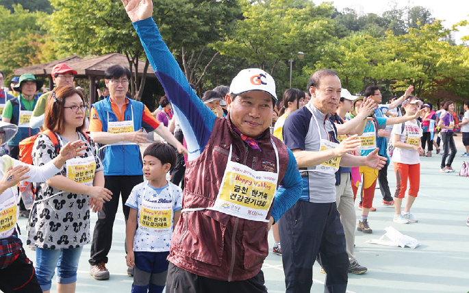 금천구는 건강의 기초가 되는 걷기운동 활성화를 통해 주민들이 보다 건강한 삶을 영위하도록 매달 다양한 테마로 안양천과 관악산 둘레길 등을 걷는 ‘Happy Walking 금천 한가족 걷기대회’를 진행한다. 또 걷기 운동 활성화에 주민이 주체가 될 수 있도록 주민 걷기 지도자도 양성했다.