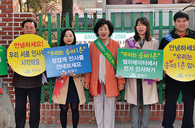 층간소음, 주차, 흡연 등으로 이웃 간 갈등이 끊이지 않고 있는 요즘, 송파구는 이런 사회문제를 해결하기 위해 ‘우리는 송파1촌, 이웃 간 인사나누기’ 사업을 진행하고 있다. 지난 4월 1일에는 인사하기 시범아파트 27개동을 선정하고, 동별로 5명 이상으로 구성된 실천리더를 위촉했다. 이 외에도 송파구는 주민들이 마을 구석구석 어디서든 책을 접하고 자연스럽게 독서에 관심을 갖는 문화를 만들기 위한 ‘책 읽는 송파’사업도 꾸준히 이어오고 있다.