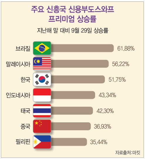 시장정보업체 마킷에 따르면 한국의 5년 만기 외국환평형기금채권(외평채)에 붙는 신용부도스와프(CDS) 프리미엄(9월 29일 기준)은 82.43bp(1bp=0.01%p)로 집계됐다. 2013년 9월 2일(83.07bp) 이후 2년여 만에 가장 높은 수치다.