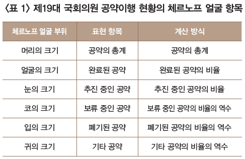 이러한 3가지 차원의 공약이행 현황을 체르노프얼굴로 표현하되 공약의 총계는 머리의 크기로, 완료된 공약의 비율은 얼굴의 크기로, 추진 중인 공약의 비율은 눈의 크기로, 보류 중인 공약의 비율(역수)은 코의 크기로, 폐기된 공약의 비율(의 역수)은 입의 크기로, 그리고 그 외의 기타 공약의 비율(역수)은 귀의 크기로 표현한다.