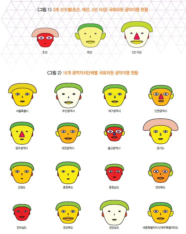 3개 선수별(초선, 재선, 3선 이상) 공약이행 현황에서 드러난 점은 다음과 같다. 머리의 크기로 표현되는 공약의 총계는 초선의원들이 가장 많았지만 얼굴의 크기로 표현되는 완료된 공약의 비율은 역시 3선 이상의 의원이 가장 높았고 약 1% 차이로 재선의원이 높았다.