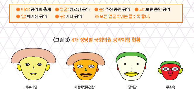 4개 정당별 공약이행 현황에서 드러난 점은 다음과 같다. 머리의 크기로 표현되는 공약의 총계의 경우는 새누리당, 새정치민주연합, 정의당, 무소속의 순으로 나타났으며, 얼굴의 크기로 표현되는 공약의 완료 비율의 경우는 정의당, 새누리당, 새정치민주연합, 무소속의원의 순서로 표현된다.