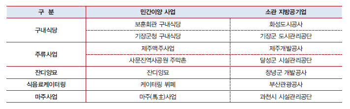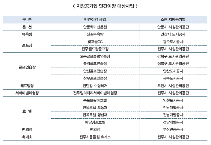 행정자치부는 지방공기업 정책위원회를 열고 「지방공기업 민간이양 사업」을 확정·발표했다. 이번에 확정된 민간이양 사업은 공공성이 낮고 민간경제를 위축시킬 우려가 있는 16개 지방공기업의 23개 사업이다. 이러한 사업에서 지방공기업이 철수하면 지역 민간경제는 활성화되고, 지방공기업은 본연의 기능과 역할에 집중하여 주민에게 보다 나은 공공서비스가 제공될 것으로 기대된다.
