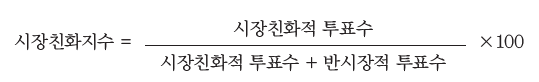 의안에 대해 각각 ‘시장친화’, ‘반시장’ 중 어디에 속하는지를 판별하였는데 중립적인 의안의 경우 고려하지 않았다. 국회의원별로 ‘시장친화’적 의안, ‘반시장’적 의안에 대해 찬성, 반대, 기권이 각각 몇 번씩 이뤄졌는지 집계해 다음과 같은 방법으로 시장친화지수를 산정했다.