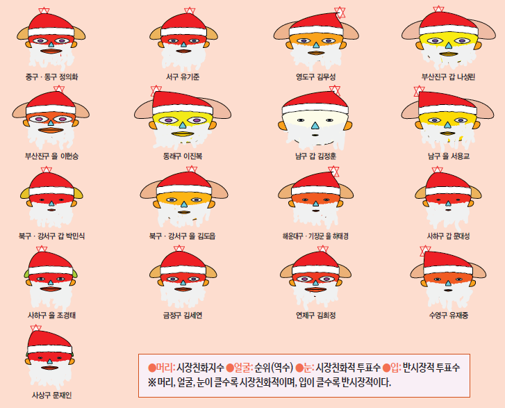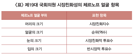 <표>에서 보여주는 대로 시장친화지수를 나타내며 머리와 얼굴의 크기, 시장친화적 투표수를 보여주는 눈의 크기는 그 크기가 클수록 시장친화적인 국회의원이라고 할 수 있고 반면에 입의 크기가 클수록 상대적으로 반시장적인 국회의원이라고 볼 수 있다.