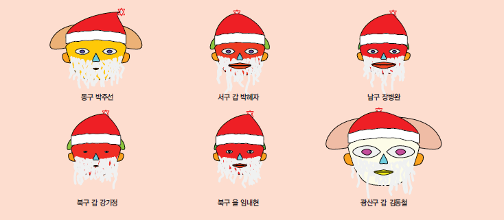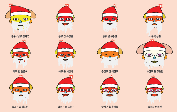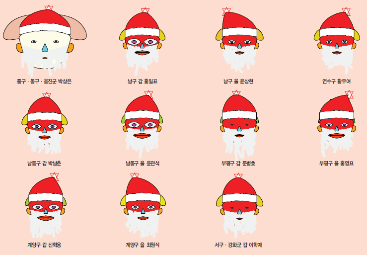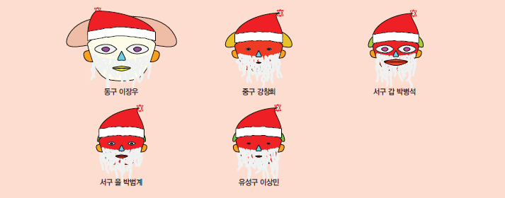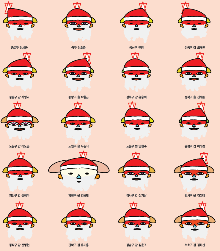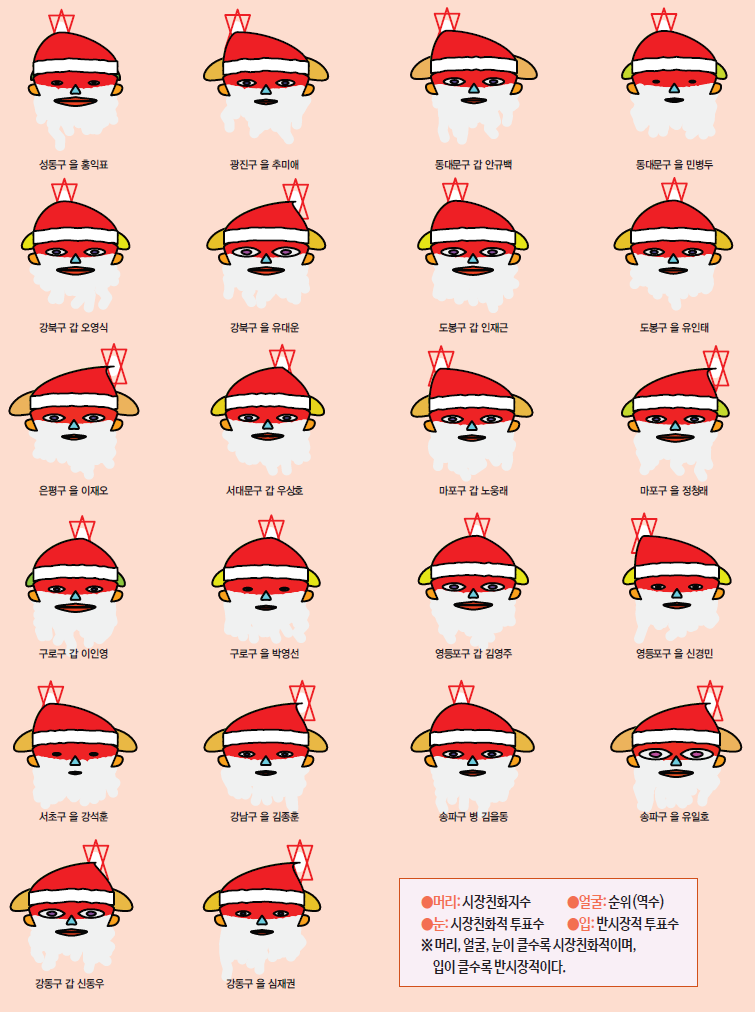 서울시의 경우에는 양천구을의 김용태 의원이 머리의 크기와 얼굴의 크기가 서울시에 지역구를 두고 있는 국회의원들 중 가장 높은 시장친화지수와 이에 따른 높은 순위를 보여주고 있다. 반면에 성동구을의 홍익표 의원, 은평구갑 이미경 의원, 구로구갑 이인영 의원 등은 시장친화지수가 낮은 것으로 보인다. 눈의 크기로 보여지는 시장친화적 투표수가 많은 의원은 노원구갑 이노근 의원, 송파구을 유일호 의원 등이며 반면에 입의 크기로 나타나는 비시장적 투표수는 홍익표 의원과 이인영 의원이 많은 것으로 보여진다.
