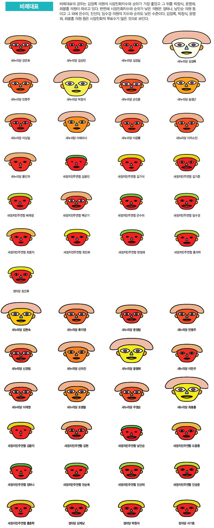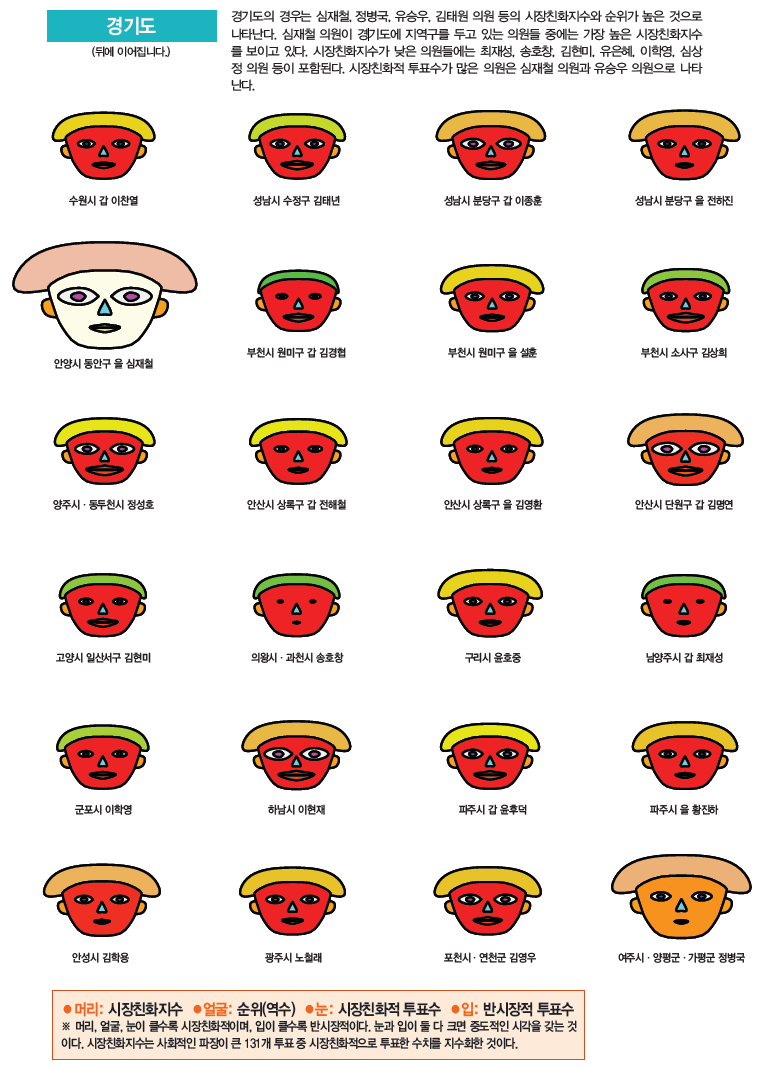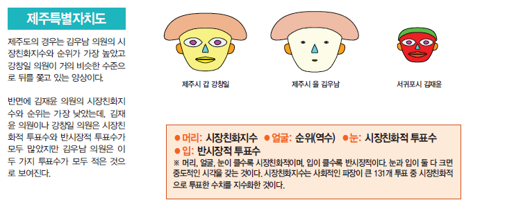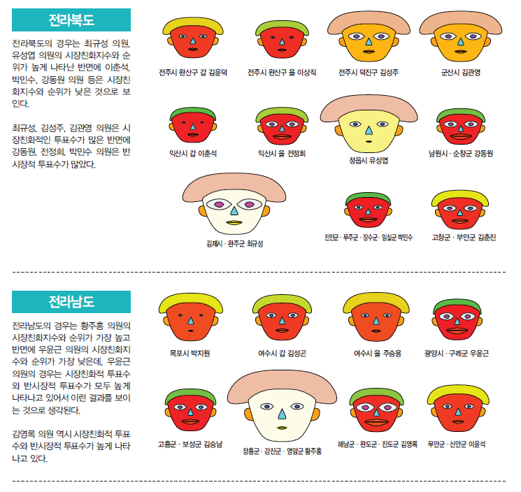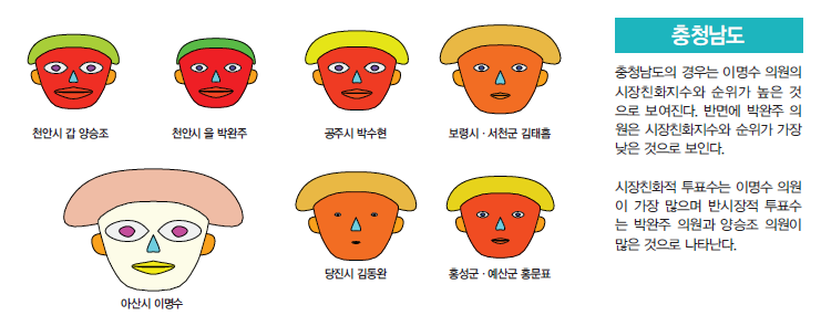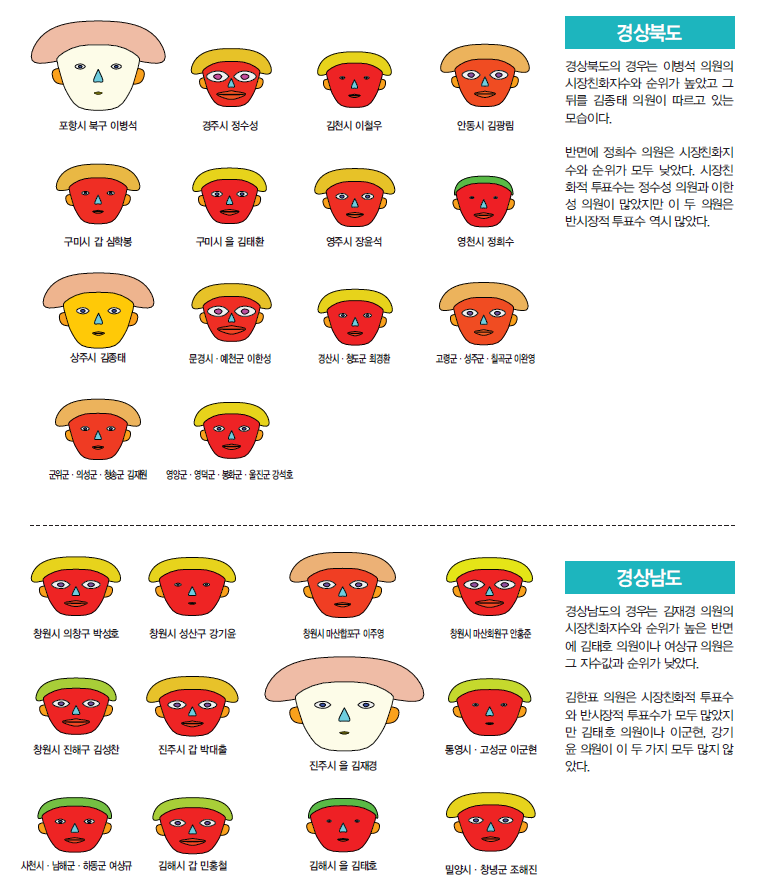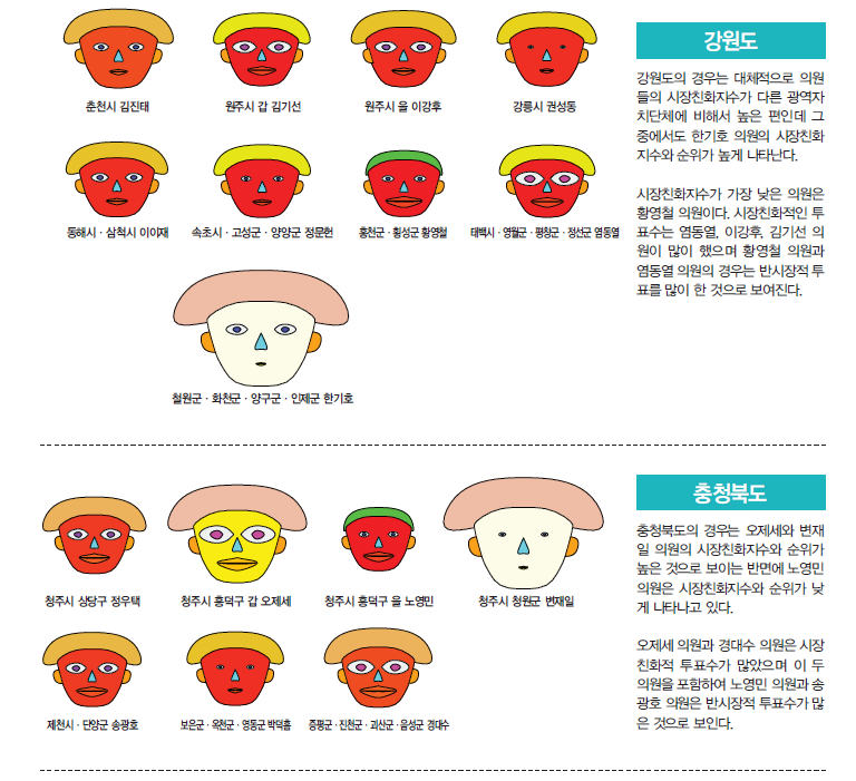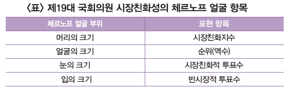 <표>에서 보여주는 대로 머리와 얼굴의 크기는 시장친화지수를 나타낸다. 시장친화적 투표수를 보여주는 눈의 크기는 그 크기가 클수록 시장친화적인 국회의원이라고 할 수 있고 반면에 입의 크기가 클수록 상대적으로 반시장적인 국회의원이라고 볼 수 있다.