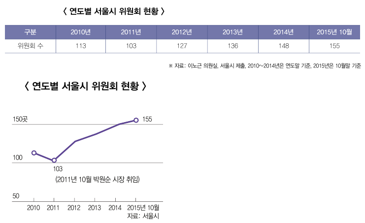 박원순 시장 취임 이후(2011년 10월) 서울시에 위원회가 약 4년간 62개가 신설돼 매월 1.3개가 만들 어졌다. 서울시가 운영하고 있는 위원회는 2012년 부터 현재까지 계속 증가해 2015년 10월말 총 155 개나 된다. 2012년 127개, 2013년 136개, 2014년 148개, 2015년 10월말 155개로 증가했다.