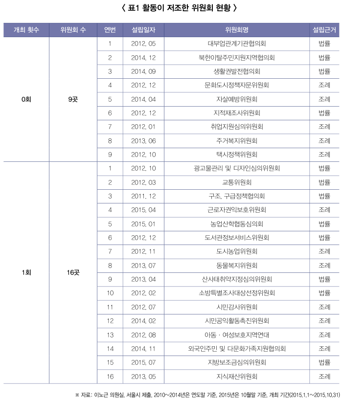 분석결과, 서울시가 운영하는 위원회는 부실운영 위원회가 많았다. 2015년 10월말까지(2015년 1월부터 10월까지 10개월 간) 회의 개최 횟수를 보면 한 번도 위원회를 열지 않은 곳이 9곳(14.5%)이었고, 한 번위원회를 연 곳이 16곳(25.8%)이나 됐다. 그 중 활동이 저조한 위원회 현황을 살펴보면 <표1>과 같다.