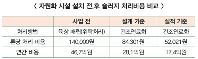 또 건조된 부산물은 화력발전소와 시멘트생산 공장의 고형연료 및 원료로 판매해 슬러지를 처리하는 과정에서 생기는 모든 것들을 완벽히 재활용하고 있다. 자원화 시설을 설치하기 전 육상에 매립하던 슬러지 처리비용은 연간 46.7억원. 자원화 시설 설치 후 매립비용, 보일러 유지비 등을 절감하고 건조한 슬러지를 판매하며 수익을 내는 등 자원과 시설을 운영하며 연간 14.6억원의 비용이 절감됐다. 군산시는 앞으로 증기보일러에 사용되는 기존의 LNG를 하수처리 과정에서 바이오가스로 대체하는 청정연료전환사업에 대해 전국 지자체 최초로 UN청정개발체제