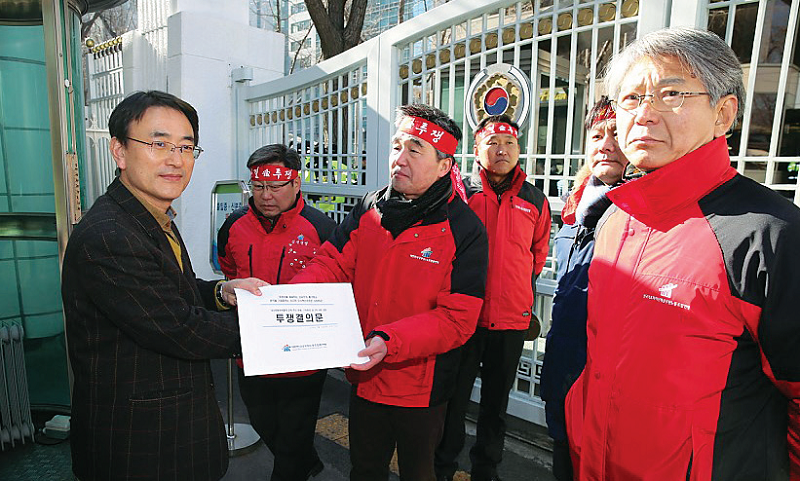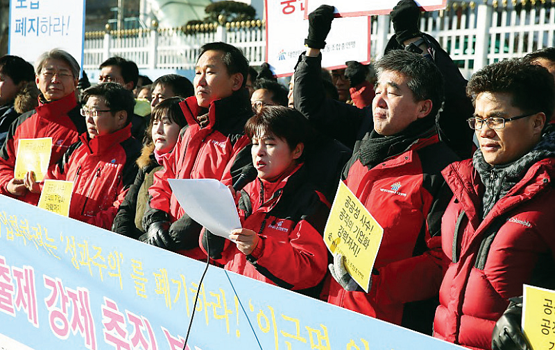대한민국공무원노동조합총연맹(위원장 류영록, 이하공노총)이 1월 12일 정부서울청사 정문에서 ‘성과연봉제·퇴출제 강제 추진 분쇄’ 관련 기자회견 및 제2차규탄집회를 개최하고 청와대와 국무총리실에 의견서를 제출했다.