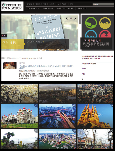 록펠러재단은 재단설립 100주년을 기념해 ‘100 Resilient Cities Challenge’를 발표하며 전 세계 도시들의 방재력 향상을 위해 1억 달러 프로 젝트를 진행하고 있다. 이 프로젝트는 세계적 으로 100개 도시를 선정하고 도시 방재력 구축을 위한 기술적 지원과 자원을 배분하고 재단은 기반시설 설립을 위한 수십억 달러 유치를 돕는 것이다.
