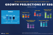국제통화기금(IMF)은 올해 세계 경제성장률 또한 종전과 같은 3.0%로 전망했다. 국가별로 보면 미국(1.8%→2.1%)과 프랑스(0.8%→1.0%), 영국(0.4%→0.5%) 등의 전망치가 상향됐고, 중국(5.2%→5.0%), 이탈리아(1.1%→0.7%), 독일(-0.3%→-0.5%) 등은 전망치가 하향 조정됐다. 일본의 경제성장률은 1.4%에서 2.0%로 0.6%p나 상향됐다. IMF는 세계 경제가 코로나19 종식과 미국·스위스발 금융 불안의 조기 해소로 상반기 안정적인 성장 흐름이 나타났지만, 중국 경기 침체와 제조업 부진이 이어지면서 점차 성장세가 둔화하고 있다고 진단했다. 물가와 관련해서는 고금리 기조와 국제 원자재 가격 하락에 따라 안정세를 보이고 있지만, 높은 근원물가(식료품 및 에너지 제외 지수)로 물가안정 목표 달성에는 상당 시간이 소요될 것으로 보여 하락세가 명확해질 때까지 긴축기조를 유지해야 한다고 조언했다. IMF는 후에 나온 지역경제전망 보고서에선 미국을 비롯한 서방진영이 중심인 경제협력개발기구(OECD) 회원국과 중국 간 디리스킹(위험 제거) 시 무역 의존도가 큰 한국이 비교적 큰 피해를 볼 수 있다고 분석했다. OECD 회원국들과