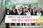 ‘규제의 백화점’ 남양주시가 규제개혁팀을 신설하는 등 적극적인 규제개혁으로 2년연속 대통령 표창을 수상했다. 취재 | 정우진 기자 경기도 남양주시가 행정자치부가 주관하는 전국 243개광역 및 기초 지방자치단체 지방규제개혁 추진실적 평가에서 최우수 기관으로 선정돼 전국 최초로 2년 연속대통령 표창을 수상하는 쾌거를 달성했다. 남양주시는서울 주변에 위치해 도시 면적의 49%인 226.57㎢가개발제한구역으로 묶여있고, 팔당댐 등의 상수원보호구역과 각종 군사시설보호구역, 그리고 수도권정비법으로 인한 다양한 규제가 중복된 ‘규제의 백화점’인 지역이었다. 남양주시는 이를 극복하고 도시 발전의 원동력을 만들기 위해 2014년 3월 규제개혁 업무를 전담할 규제개혁팀을 신설했다. 특히 규제개혁팀은 ‘자체개선 가능한것부터, 현장 중심으로, 시민·기업 활동을 제약하는규제부터 개혁한다’는 목표 아래 각 부서와 협업해 현장에서 직접 숨은 규제를 발굴하는 등 적극적인 규제개혁을 추진했다. 또한 시민·기업인과의 간담회, 규제개혁 민관합동 토론회, 추진상황 보고회, 규제개혁위원회를 개최해 규제의 문제점과 성과를 공유하는 등 규제개선 완화를 위해 노력하였다. 그 결과 지난