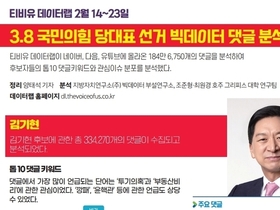 2월 14~23일 데이터랩 분석 티비유 데이터랩이 네이버, 다음, 유튜브에 올라온 184만 6,750개의 댓글을 분석하여 후보자들의 톱10 댓글키워드와 관심이슈 분포를 분석했다.