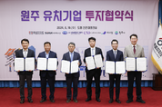 강원특별자치도와 원주시는 유치기업 4개사와 1,599억 원 투자・182명 신규고용을 내용으로 하는 투자협약(MOU)을 6월 19일 체결했다. 도청에서 열린 협약식에는 김진태 강원특별자치도지사와 원강수 원주시장을 비롯해 ㈜비씨월드제약, ㈜세아특수강, ㈜셀락바이오, ㈜제네웰 등 4개 기업 대표 및 관계자가 참석했다. 유치기업 4개사는 원주기업도시 및 반계일반산업단지에 각각 공장을 짓고 설비투자를 진행하며 총 1,599억 원의 투자와 182명의 신규고용을 추진하기로 했다. 이에 따라 도와 시에서는 이들 기업의 원활한 투자활동을 위해 필요한 행정・재정적인 지원과 협력을 뒷받침할 예정이다. 원주 기업도시에 공장 신설을 계획 중인 ㈜비씨월드제약(대표 홍성한)은 항생제, 해열진통소염제 등을 전문 생산하는 혁신형 제약바이오 기업으로 코스닥 상장기업이다. 해외수출용 GMP인증을 받은 항생제 전용 제조라인 구축을 위해 이번 원주 투자를 결정하게 됐다. 문막 반계산단에 있는 ㈜세아특수강(대표 이강현)은 코스피 상장 대기업으로, 전기차 부품전용 제조라인 구축을 위해 이번 공장 증설을 결정했다. 지난 1월에는 자회사인 ㈜세아메탈을 흡수합병, 사내 인적・물적 자원의 효율성을 높였으며