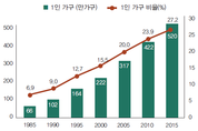 연도별 1인 가구 비율 (2015년 인구주택 총조사 결과) 2015년 1인 가구 비율은 27.2%(520만 가구)로 2010년 23.9%(422만 가구)에서 3.3%p(99만 가구) 증가했다. 1990년의 1인 가구 비율은 9.0%(102만 가구)였으며, 25년 동안 18.2%p(418만 가구) 증가한 것이다. 시도별 1인 가구 비율 (2015년 인구주택 총조사 결과) 시도별 1인 가구 비율을 보면 강원도가 31.2%로 가장 높았고, 인천이 23.3%로 가장 낮았다. 주요국가 1인 가구 비율을 살펴보면 미국 28.0%, 영국 28.5%, 일본 32.7%, 노르웨이 37.9%다. 주민등록상 세대원수별 세대현황 1인 세대 증가추이 주민등록 통계상 가구원이 1명인 1인 가구가 739만 가구로 전체 가구의 34.8%에 달하는 것으로 나타났다. 행정자치부가 분석한 9월 말 기준 주민등록 통계에 따르면 전체 2121만4428가구 가운데 1인 가구가 34.8%로가장 많았다. 1인 가구의 가구주 연령은 50대가 19.7%로 가장 많고 40대가 17.5%, 30대 17.1%, 60대 14.9%순이다. 만 17세 미만인 미성년 1인 가구는 8918가구(0.1%), 만