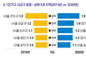 통계청이 2020년 기준 1인 가구 통계를 발표했다. 1인 가구의 연령대별 비중을 보면 20대가 19.1%로 가장 많고, 30대, 50대, 60대, 40대 등의 순이었다. 여자는 60대 이상 고령층의 비중이 높고, 남자는 30~50대의 비중이 높았다. 1인가구의 사유는 본인의 학업과 직장이 24.4%였고, 배우자의 사망, 혼자 살고 싶어서 등의 순이었다. 20년 10월 취업자인 1인 가구는 370만 가구로 59.6%가 취업 중이고, 연령대별로는 50~64세(27.7%), 30대(22%), 40대(18.9%) 순으로 비중이 높았다. 2019년 1인가구의 연소득은 2,162만원으로 전년보다 2.2% 증가했지만 전체 가구(5,924만원)의 36.5%에 불과했다. 21년 기준 1인가구의 53.2%는 본인 스스로 노후생활비를 마련하고, 정부와 사회단체(31.2%), 자녀와 친척지원(15.6%) 순이었다. 20년 기준 1인가구가 가장 많은 시군구를 살펴보면 서울 관악구, 경기 화성시, 서울강서구, 경기 부천시, 서울 송파구 순이었다. 연령대별 1인가구의 시군구별 분포에서는 20세 미만 1인가구는 대전 유성구, 대전 동구, 대전 서구 등의 순이었고, 20대와 30대 1인