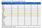OECD는 중간경제전망 보고서에서 세계 경제의 GDP가 올해 5.7%, 내년에는 4.5% 각각 성장할 것으로 내다봤다. 지난 5월에 전망한 것과 비교해 올해 성장률은 0.1% 낮추고, 내년 성장률은 0.1% 상향 조정했다. G20은 올해 6.1% 내년 4.8% 성장할 것으로 예상했다. 선진국 경제는 유럽의 강력한 경제적 반등, 내년 중 미국의 추가적인 재정지원, 그리고 가계 소비가 되살아나 성장 전망이 밝다. 올해 나라별 성장률 전망은 캐나다 5.0%, 독일 2.9%, 프랑스 6.3%, 이탈리아 5.9%, 스페인 6.8%, 영국 6.7%, 미국 6.0%이다. OECD는 올해 우리나라의 성장률을 4.0%로 지난 5월 전망치보다 0.2% 상향했다. 내년 성장률은 2.9%로 5월보다 0.1% 높였다. 일본은 올해 2.5%, 내년에 2.1%, 중국은 올해 8.5%, 내년에 5.8% 성장할 것으로 전망했다. 세계 경제의 GDP는 이미 코로나 팬데믹 이전 수준을 넘어섰으나 올해 중반 생산량 수준은 팬데믹 이전에 비해 아직까지 3.5% 낮은 수준에 머물고 있으며, 백신 접종률이 낮은 신흥 개도국에서 생산과 고용 간 격차가 상존한다고 OECD는 분석했다. 미국의 경우 생산